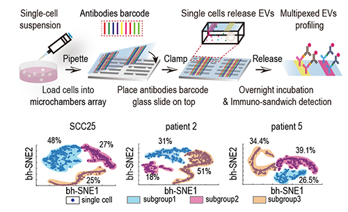 本項研究中,研究人員利用抗體條形碼陣列微流控芯片,實現(xiàn)了高通量同一單細(xì)胞來源的多種外囊泡的免疫分型;并將其應(yīng)用于口腔鱗癌細(xì)胞系及多例口腔鱗癌病人手術(shù)組織樣本原代細(xì)胞中,初步發(fā)現(xiàn)了腫瘤轉(zhuǎn)移相關(guān)的外囊泡亞群;還實現(xiàn)了對同一單細(xì)胞的分泌蛋白與外囊泡的多指標(biāo)、并行分析,發(fā)現(xiàn)蛋白與外囊泡的分泌由不同的細(xì)胞亞群來主導(dǎo)。